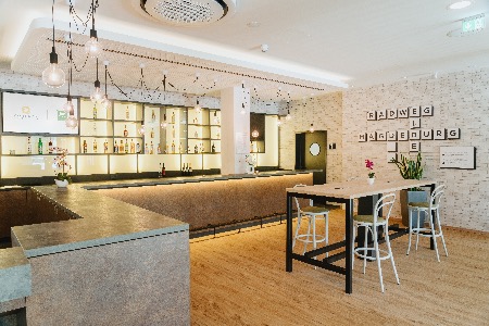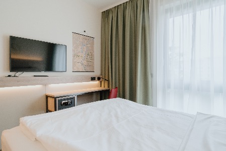 Über dem allgemeinen Funktionsbereich im Erdgeschoss „schweben“ die Zimmeretagen als herausgezogener Quader. Die im Staffelgeschoss liegenden Familienzimmer werden von einem transparenten Flugdach beschattet. Ein besonderes Augenmerkt liegt auf der dunklen Alu-Cobond-Holz-Glas-Fassade, welche dem Gebäude seinen zeitgemäßen und nachhaltigen Charakter gibt.