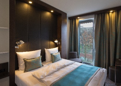 Über dem allgemeinen Funktionsbereich im Erdgeschoss „schweben“ die Zimmeretagen als herausgezogener Quader. Die im Staffelgeschoss liegenden Familienzimmer werden von einem transparenten Flugdach beschattet. Ein besonderes Augenmerkt liegt auf der dunklen Alu-Cobond-Holz-Glas-Fassade, welche dem Gebäude seinen zeitgemäßen und nachhaltigen Charakter gibt.