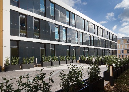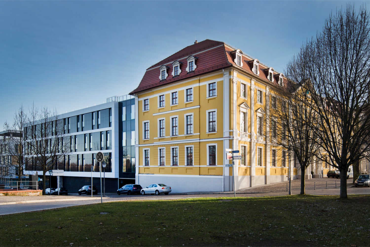 Die zurückhaltende Alu-Cobond-Glas-Fassade des Neubaus fügt sich nahtlos an die historisch restaurierte Bestandsfassade an.