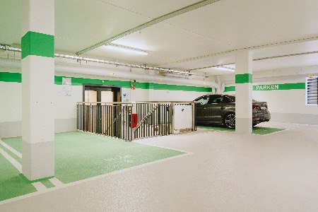 Der fünfspännige Wohnneubau und der benachbarte Hotelneubau bilden mit ihrer L-förmigen Struktur einen dreiseitig geschlossenen, ruhigen und intensiv begrünten Innenhof. Dieser ist mit zwei Parkdecks unterlagert.